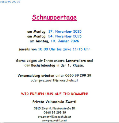 Wir laden alle interessierten Familien mit den im kommenden Schuljahr schulpflichtigen Kindern ein, in der PVS Zwettl Lernateliers und den Buchstabentag live mitzuerleben, und freuen uns auf Ihren Besuch.